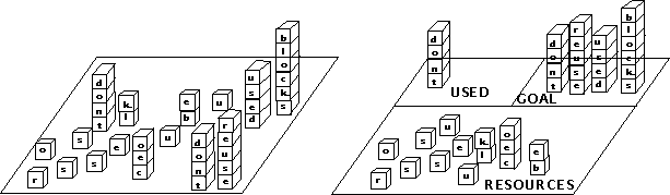 Why might this be a good idea? Because it serves as a proof that there exists a goal linearization that will work. If we can build SPACE MATTERS horizontally we know we can build it vertically. We can guarantee construction. At first this may not seem to be an advance over simply building the towers directly. The benefits of informationally structuring the world do not appear to be worth the effort. But if we factor in that the constraints on horizontal movement are weaker than those on vertical stacking, we can see that to solve the problem on the ground is to solve the problem in a more abstract space. On the ground, we can pick up and move a block regardless of whether it is sandwiched between blocks. And if we leave space between blocks we can insert a block without first shifting the others around. Hence, we can save many steps by solving the problem on the ground first, since if there is going to be external trial and error search in finding the goal ordering, there are far fewer moves to make on the ground. It is easier to solve the problem on the ground.