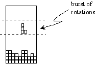 In Tetris, pieces enter the board from the top and the player has to decide whether to move them right, left or to rotate them. We have found that there is a burst of rotational activity in a region about 800 ms to 1800 ms when the player is working out where to place the piece. External rotation can be as fast as 150 ms, whereas internal rotation takes five to ten times as long.