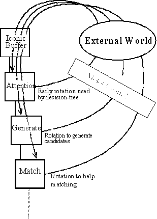 The trick, in every case, is to modify visual input at exactly the right time to supply information needed by other computations. This is a version of just in time inventory control, only here, the inventory is informational. The effect is a highly interactional computation, where the information for a step in the computation is sometimes provided internally, and sometimes the information is provided externally. What binds the two together into a tightly coupled system is their timing. See figure 11 for a sketch of the kind of process model this suggests.