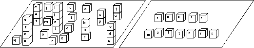 One theme which has been recurring, but which I have left largely unexamined, is that many of our structuring actions serve to reduce the descriptive complexity of our environments. This makes it easier to track the state of the environment. The idea first surfaced in our discussion of the advantage of organizing lettered blocks alphabetically, or into known chunks, such as morphemes. A planner who first arranges blocks alphabetically reduces the need for visual search because he or she is able to describe the state of the environment more compactly. The position of a block in an alphabetical list is known by heart, so it can be generated without further knowledge of the particulars of the environment. The same applies if we organize blocks into well known units, given an environment in which the letters TEOEPPAPTTASSCERLAEP appear, we put such as ; we put a much smaller strain on Working Memory if we manage the environment so that the stimulus we see is chunked as in PET TAPE APPLE SOCRATES. Preprocessing the world saves processing the representation of the world. Put another way, the greater our understanding of the organization we maintain outside, the less we have to memorize.